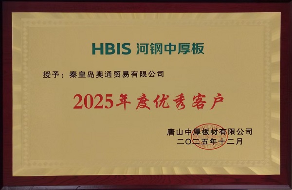在河鋼集團中厚板板塊的年度評選中,秦皇島奧通貿(mào)易有限公司憑借卓越的服務能力、堅實的合作基礎以及良好的行業(yè)口碑,從眾多合作伙伴中脫穎而出,被授予“2025年度優(yōu)秀客戶”榮譽稱號。